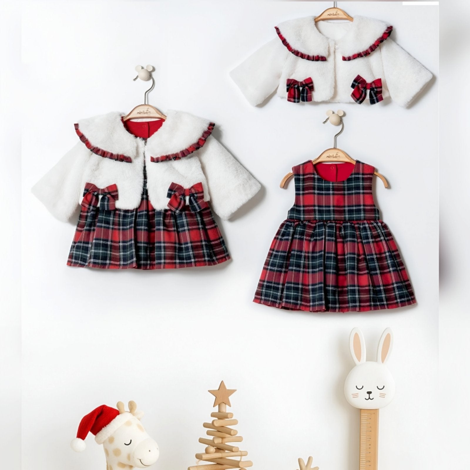 Luxurious Babygirl Party Dress with classic Red/Green print with a Luxurious Coat with Collar and Bows.