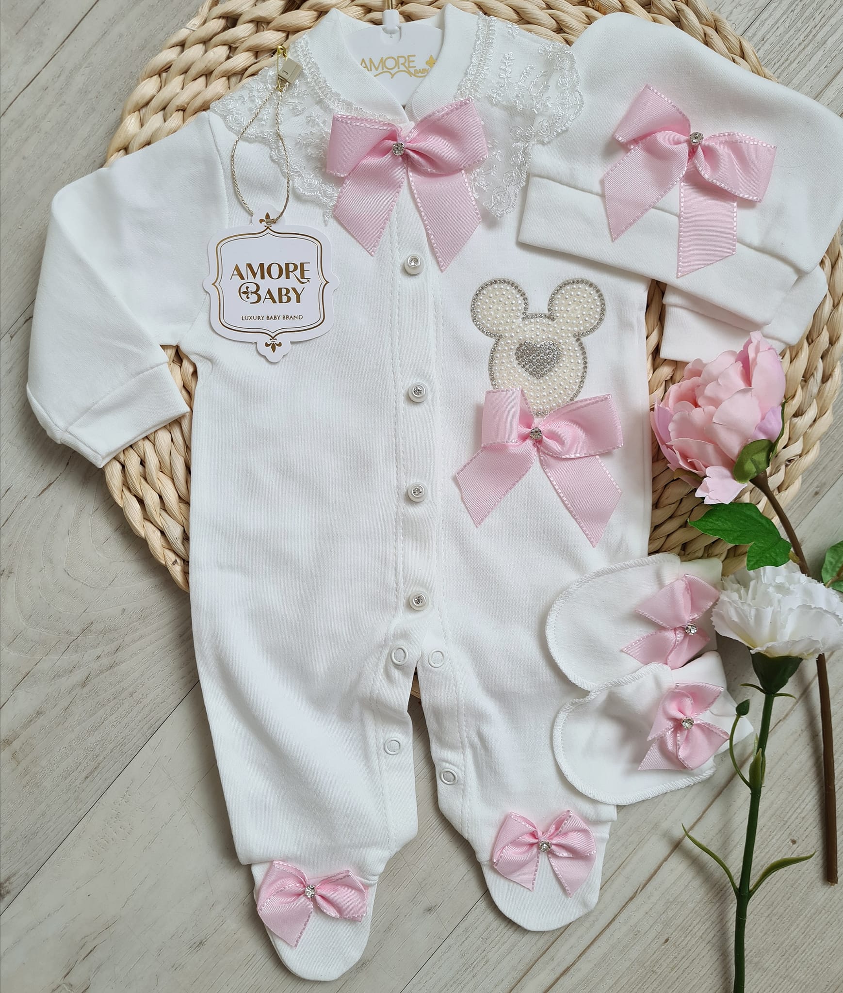 Beautiful Exclusive Playsuit with Diamond Minnie stones and finished with Lace Collar and bows.