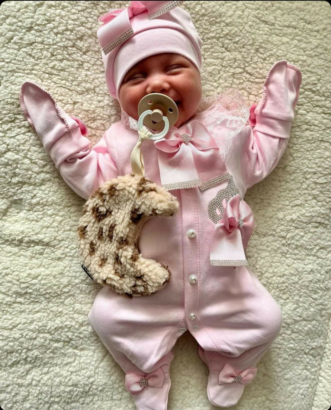 Comes with a matching hat and Baby Mittens. The Playsuit has a unique color combination of Pink and White.